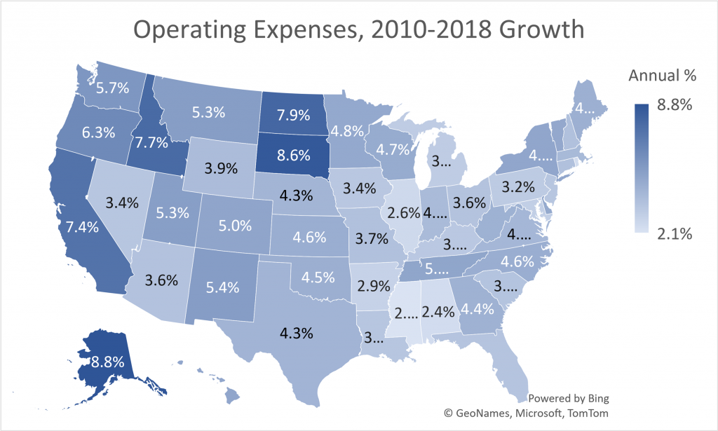 - On a per-capita basis, hospital expenses in North Dakota were highest in the nation in 2017, and their growth rate of about 8% per year since 2010 was among the fastest in the U.S.